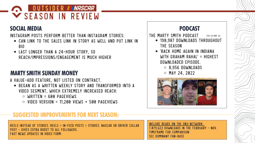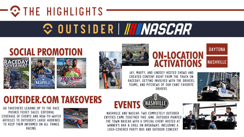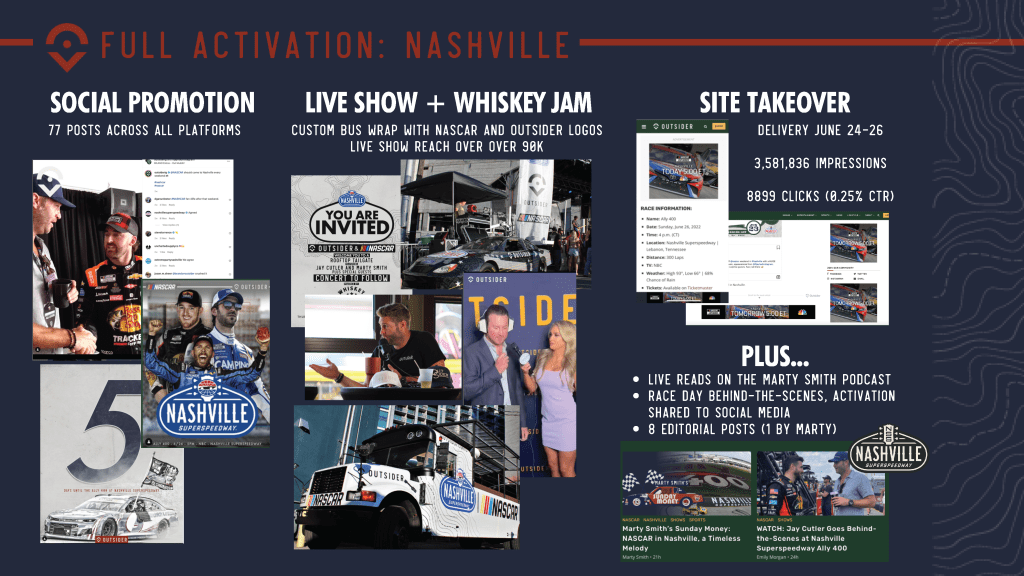 – Included a live concert event activation, live on-location podcast with Marty Smith in Daytona, website ad takeovers, podcast reads across network, and other various social promotion